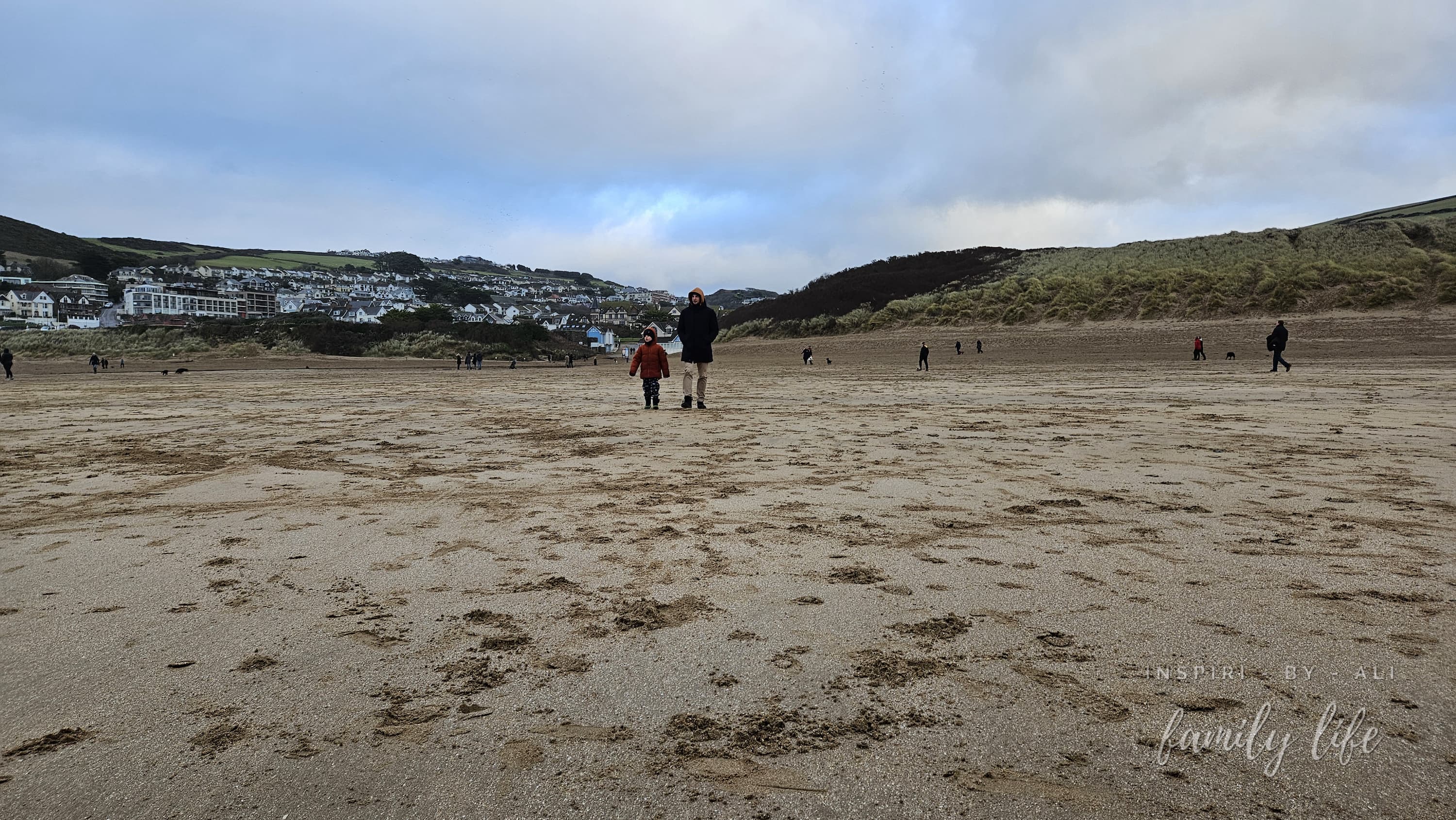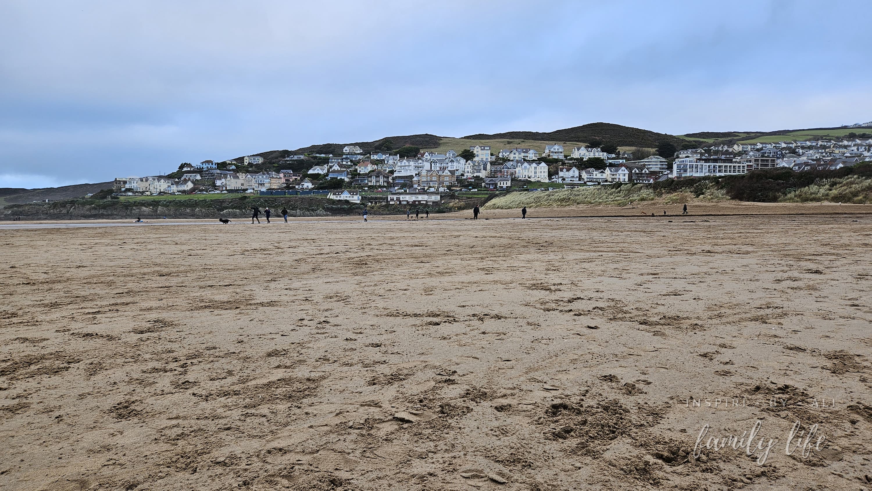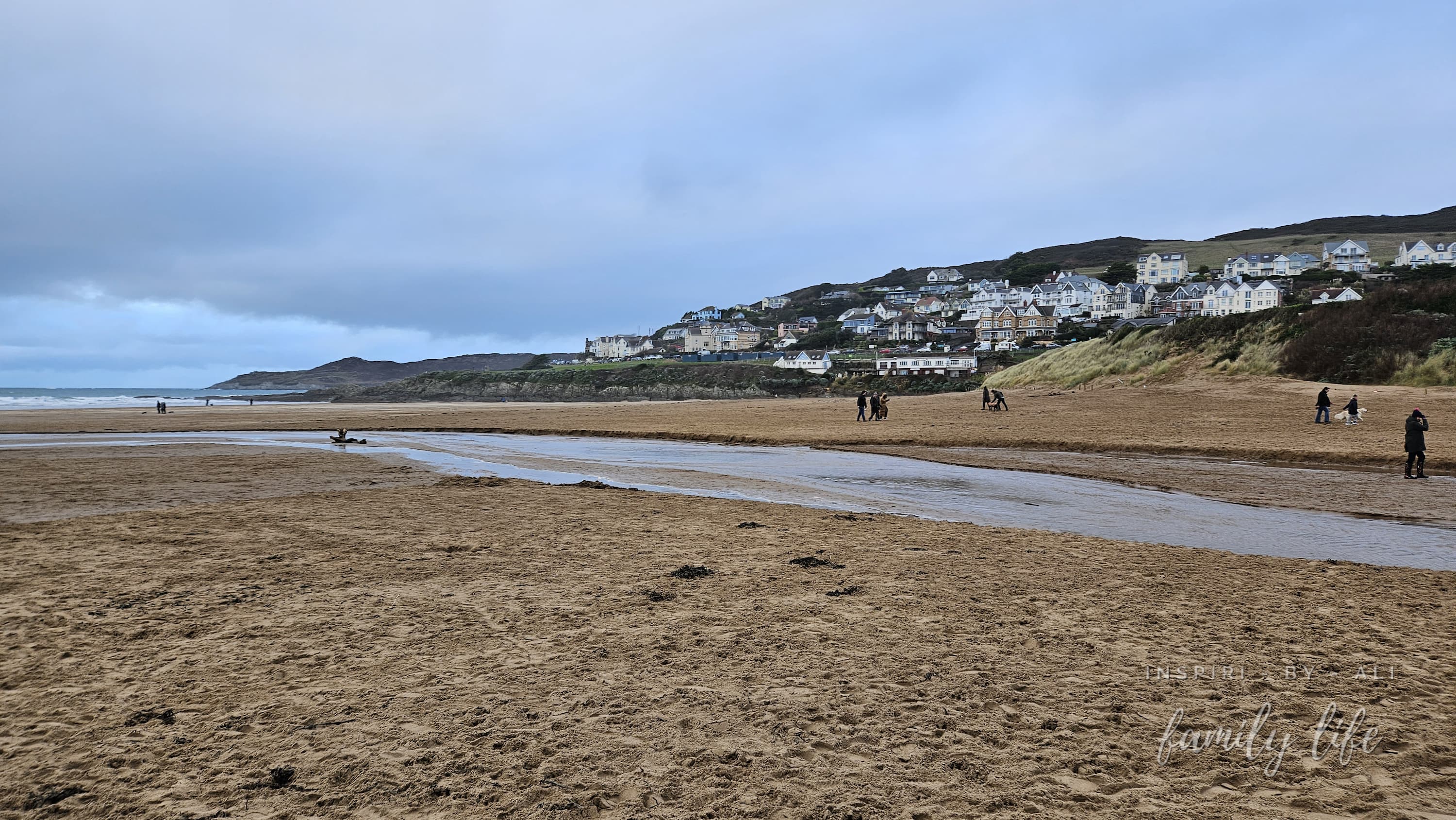 Woolcombe - miejscowość w hrabstwie Devon z angielsko-dziką plażą - po jednej stronie angielskie domki a po drugiej dzikie pagórki, a plaża bardzo obszerna. Tego dnia było tu dosyć wietrznie ze strony oceanu.